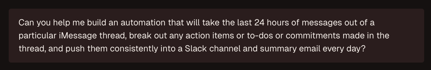 DIY API: in a lot of cases you have Zapier. But when you don’t or when you’re working with data that’s privileged in some way, you can have Claude code build you a translator. In my case, I’ll sometimes use a tool like granola to transcribe meetings and generate action items and I built myself a custom Apple shortcut automation that every day grabs all my action items out of granola and pushes them into my Apple notes, which is much closer to my system of record For tasks. Again, vanishingly simple if you’re an engineer, but completely opaque otherwise.