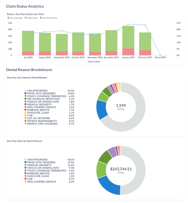 Practices use us to monitor claims in their backlog; these include no-response claims (where you haven’t heard from a payer in a number of days) or denied or appealed claims. In this use case, we give you more data and cover more payers than available via EDI, and save your team the time they’d spend looking up these claims by hand.