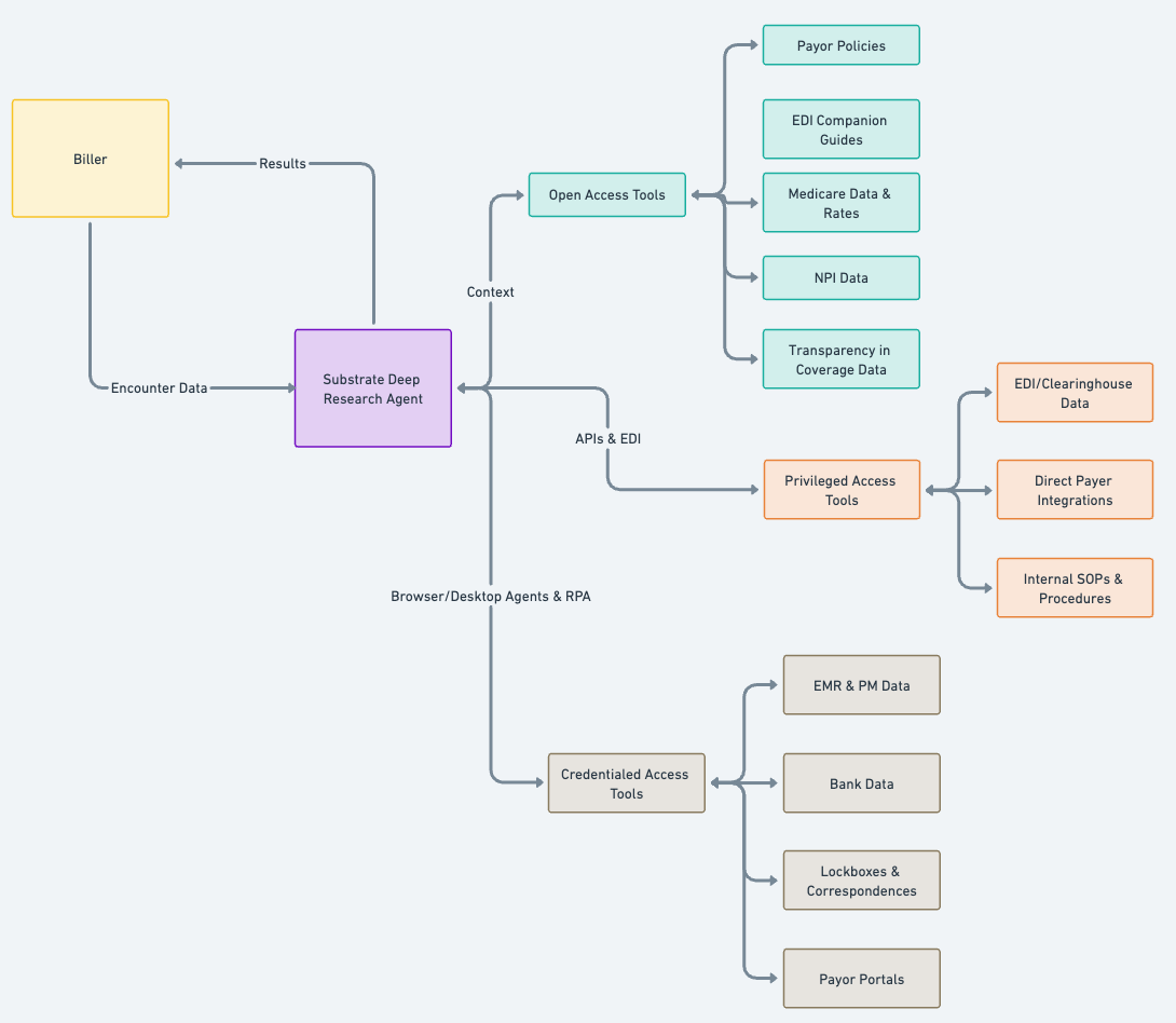 These are tools where the agent needs the practice to grant access. The way to think about this as a healthcare practice is; “what’s the set of logins you’d give to a new hire on your billing team?” Access might be login credentials to payer portals or a practice management system or bank account, or might be internal documents like SOPs or payer contracts. These are effectively the same tools a human would use to investigate claims.