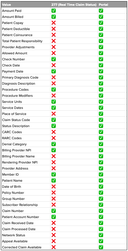 The worst part is this isn’t consistent; while the portal is always richer, the 277 might actually be sufficient for the problem you’re solving. You just don’t know until you see the results. And there are a handful of large payers (Medicare and Tricare in particular) that don’t support the 277 transaction type.