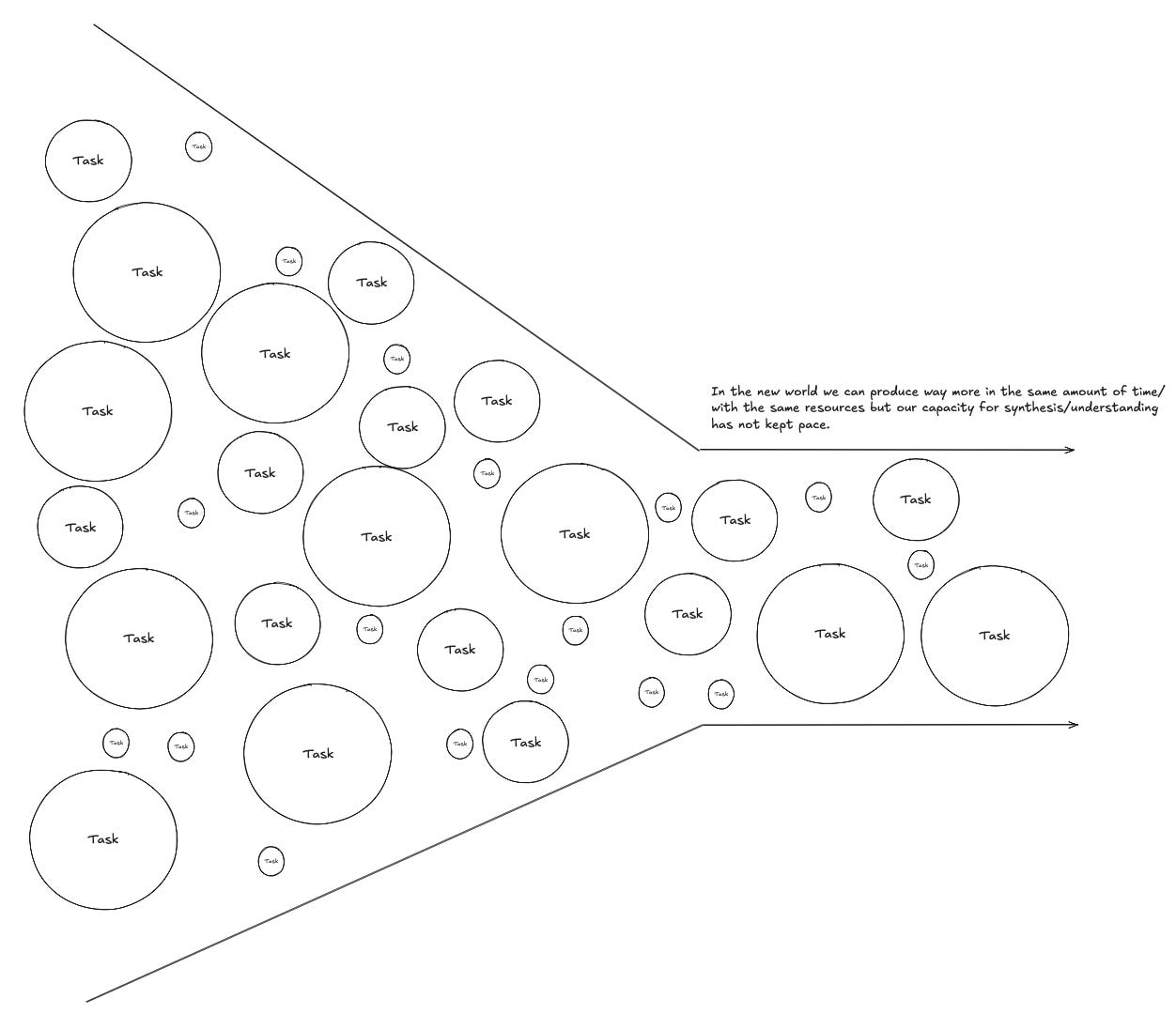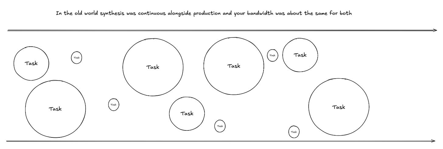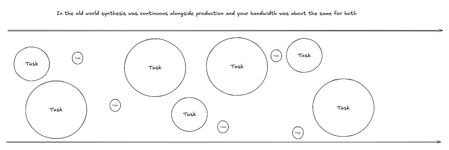 Imagine you had a bunch of grunt work that was blocking something downstream, and now you’ve automated it all away. Sometimes it’s enough to sit down for 30 and really think things through + consider it. Sometimes that process takes days + discussions because something new is possible to build and that thing is not super obvious, but you still need to ship the original thing that the grunt work was the foundation for. So you immediately go to shipping, and haven’t spent the time to understand the novel insight yet. You have a tactical win (you shipped way faster than you could before) but you don’t have as much time to understand what it means for your business, which is important and drives long term compounding.